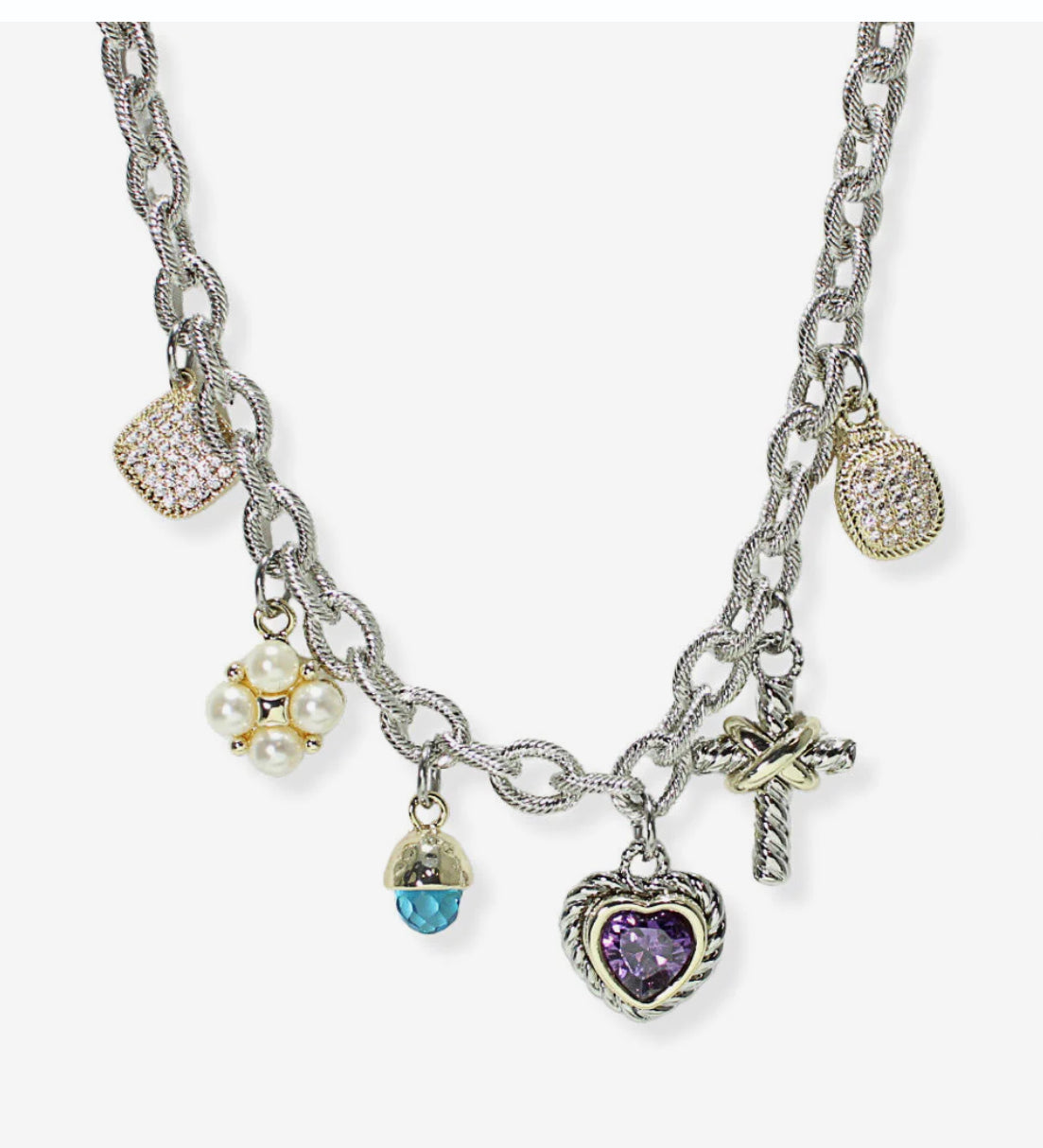 Charm necklace accented with several different charms from a heart,cross and many other charms. It’s a true statement piece! All sales final